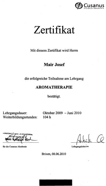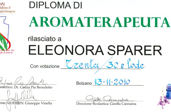 Scuola di Naturopatia a Bolzano "AIODIBIN": dalla Prof.ssa Gisella Cannarsa e Pino Vinella - diploma di aromaterapeuta » vedi diploma